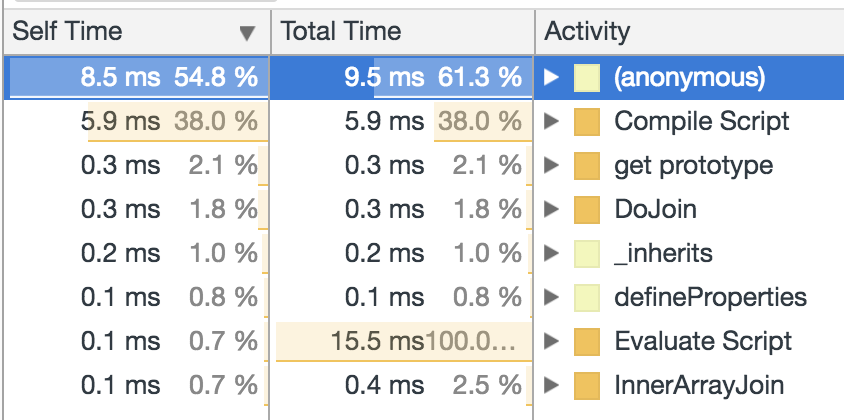 rollup没有生成这些额外的东西,执行耗时主要在于Compile Script和Evaluate Script上,其余部分可以忽略不计,如下图: