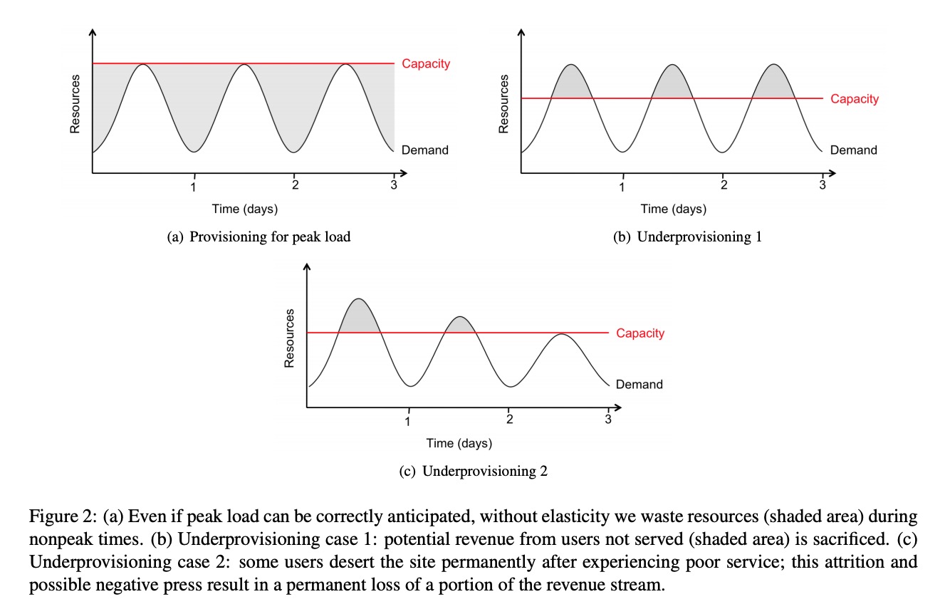 实际上,数据中心服务器的利用率一般只有 5%到 20%,因为需求峰值通常超过平均值 2 到 10 倍,而应对需求高峰的唯一方法就是提前预配资源。但并非所有的需求高峰都能提前预知,比如新闻事件引发的需求爆发,此时云计算所提供的资源弹性尤为重要