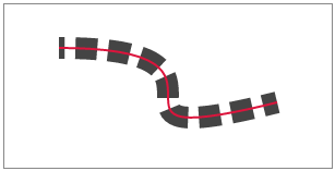 A dashed stroke with a non-zero dash offset. The dashing pattern is 20,10 and the dash offset is 15. The red line shows the actual path that is stroked.