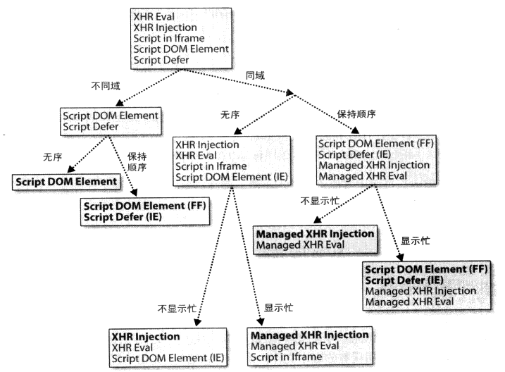 Internet Explorer中的Script Defer技术和Firefox中的Script DOM Element技术是首选方案。Managed XHR Injection和Managed XHR Eval技术也是可行的。但是她们会给主页面增加额外的代码,而且实现它们更复杂一些。
