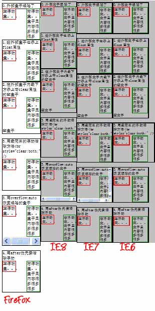 这其实是对空盒子方案的改进,一种纯CSS的解决方案,不用引入冗余元素。这是书中推荐的也是网络上给出的最佳解决方案,但问题是[IE7-]并不支持after伪元素,书上说[IE6-]要配合hack:.wrapper{height:1%;}共同使用,暂且不论谁对谁错,因为[IE7-]好像根本不会出现问题,我们看图说话。