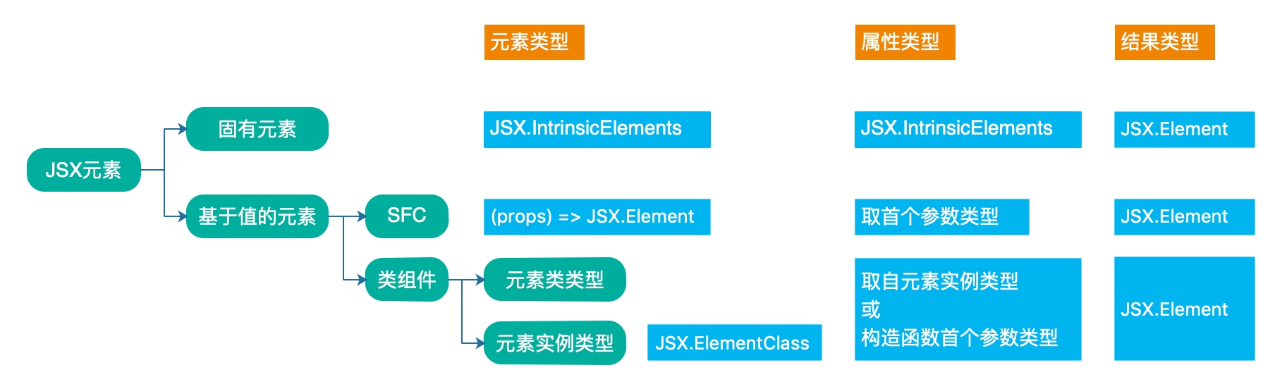 TypeScript 中 JSX 的类型支持分为元素类型、属性类型和结果类型 3 部分,如下图: