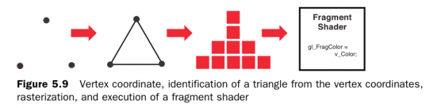 注意:片元着色器的内置变量gl_FragCoord保存着片元的坐标信息(gl_FragCoord.x, gl_FragCoord.y),如果能够输出的话,就会发现片元着色器逐顶点执行的过程,但API没有提供输出信息到console的方法,我们可以根据片元坐标设置颜色来验证