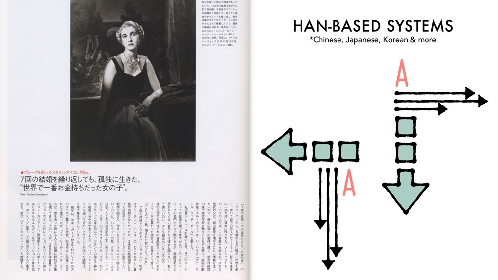 汉字系统包括CJK语言,中文、日文、韩文等等,有两种布局方式,有时会一起出现